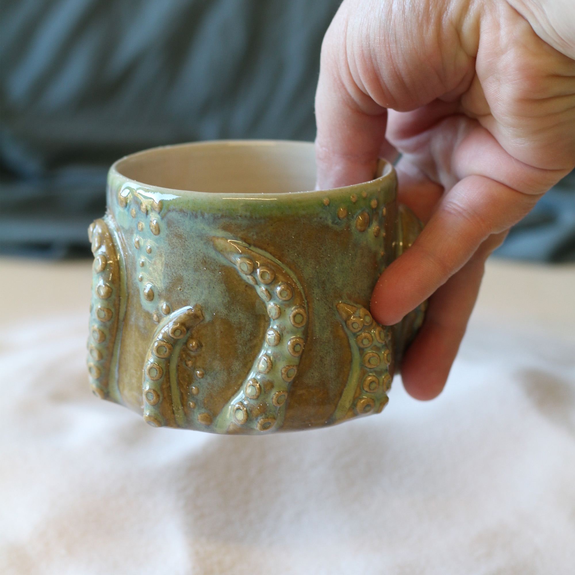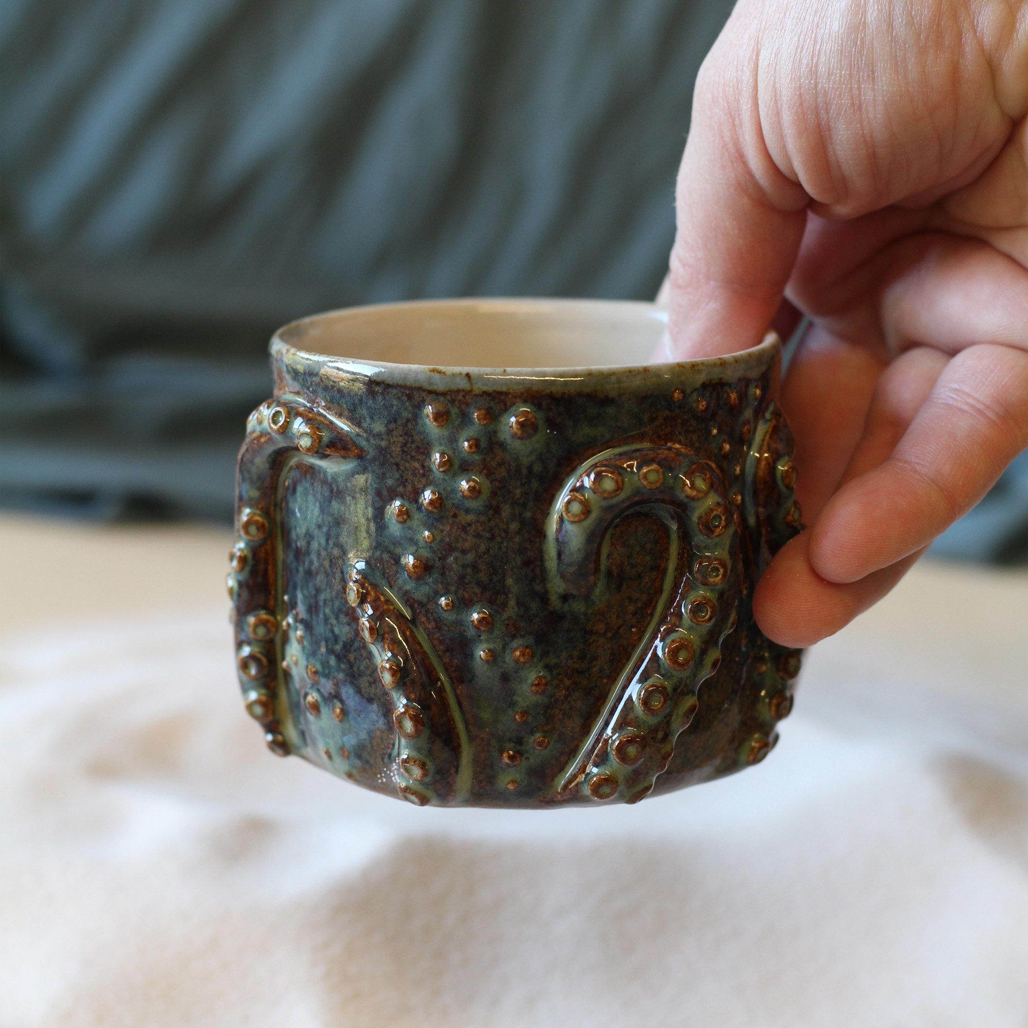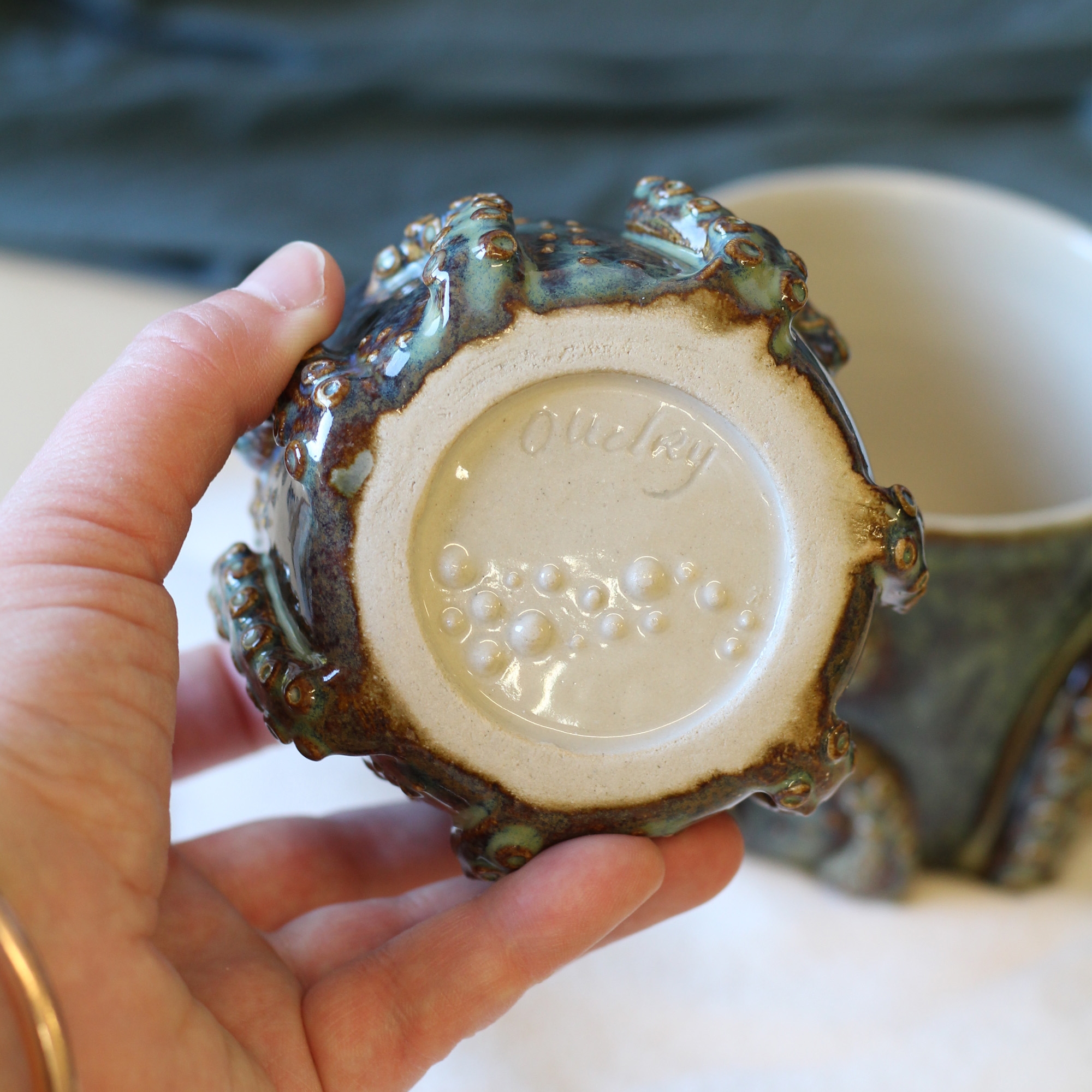 Les tasses Poulpi sont réalisées avec la technique du tournage et sont ornementées de tentacules qui viennent enserrer la pièce comme un bien précieux.
